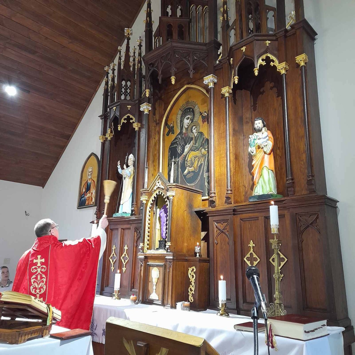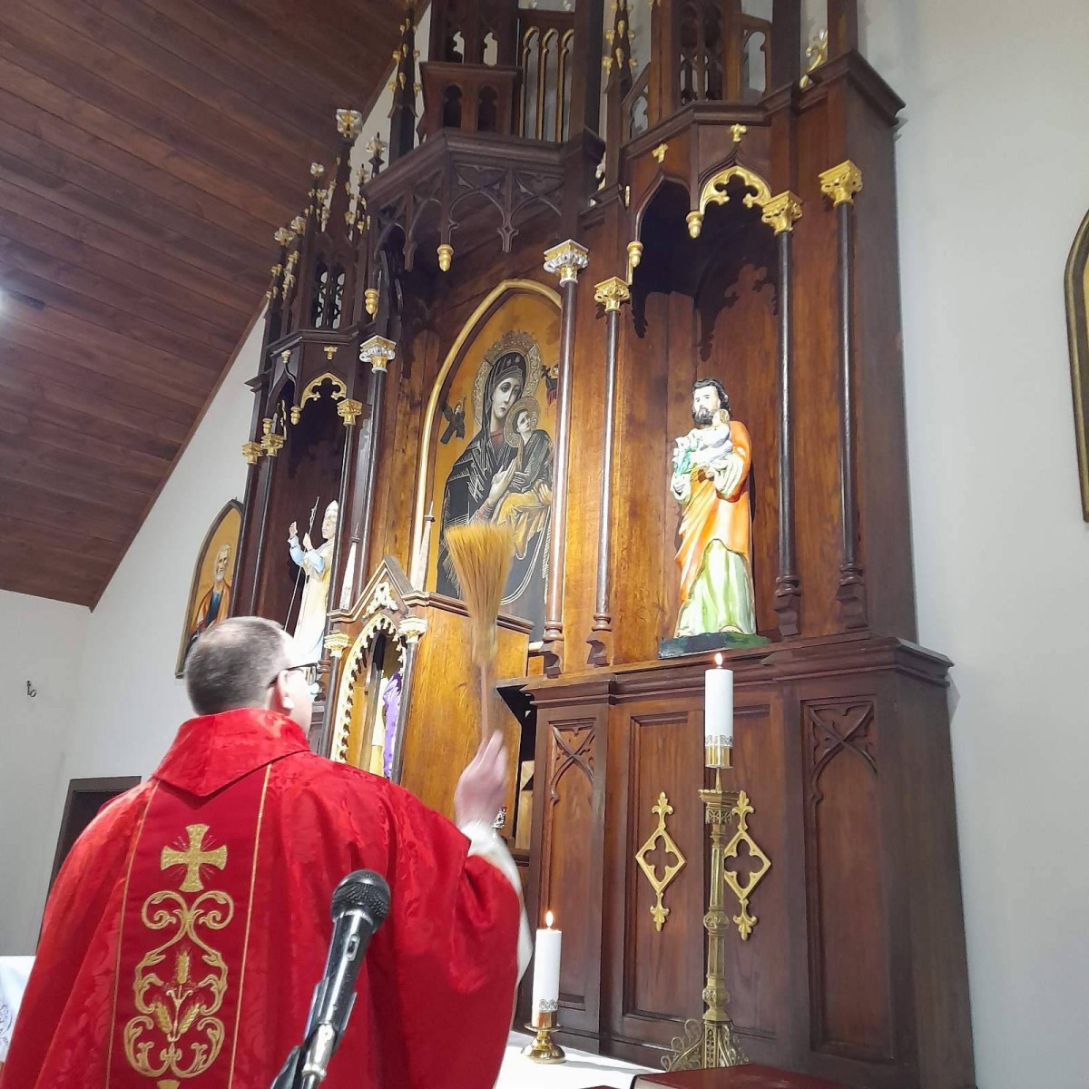 Кілька фотографій з сьогоднішніх Святих Мес. В Червоному о. Гжегож посвятив нові фігурки в вівтарі : Св. Йосифа і Св. Івана Павла ІІ, а також новий Месал Римський (книжку з котрої священник відправляє Святу Месу).