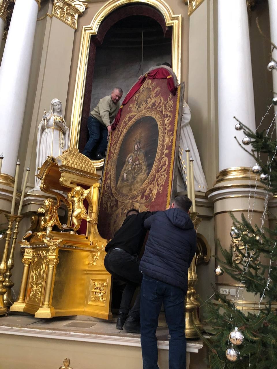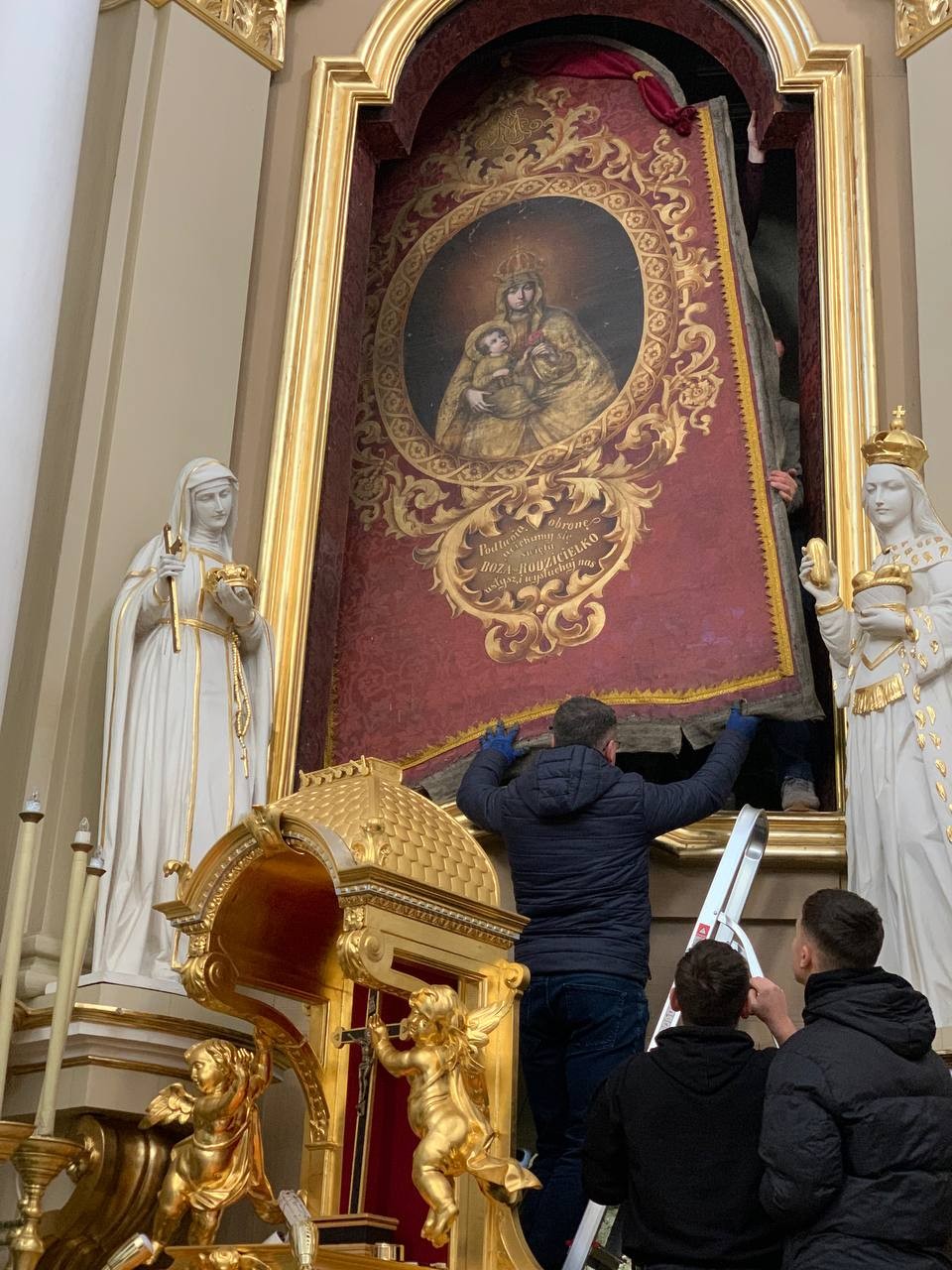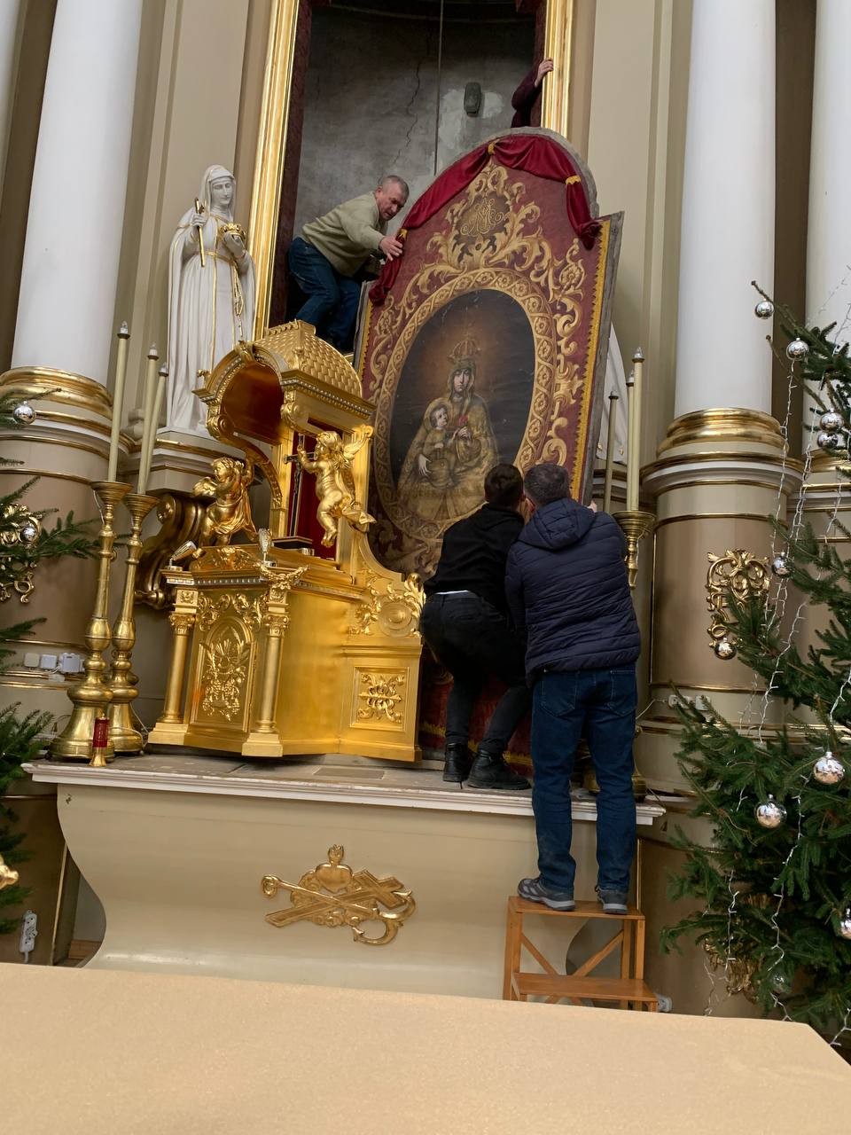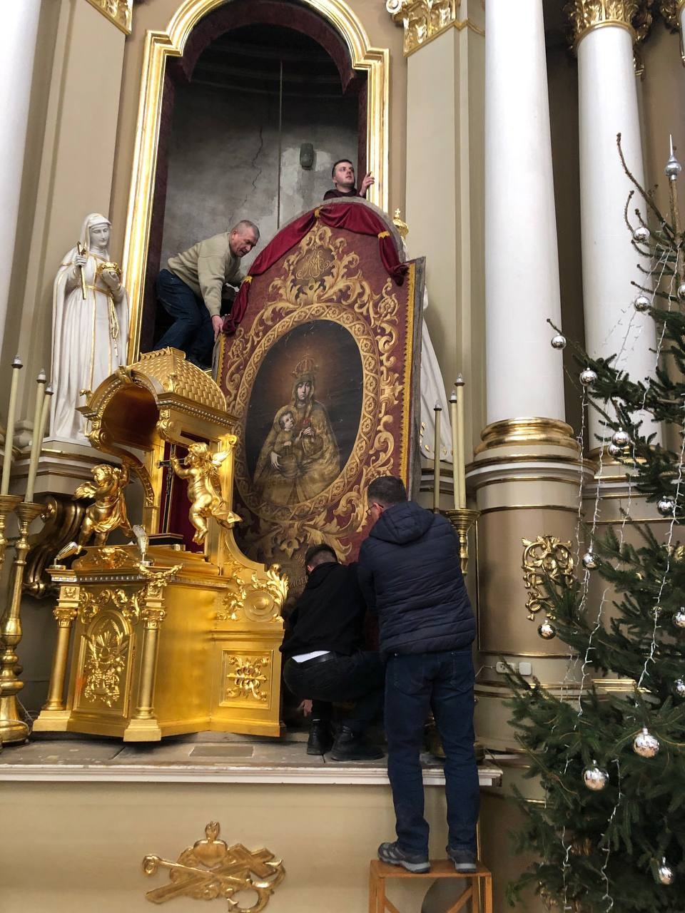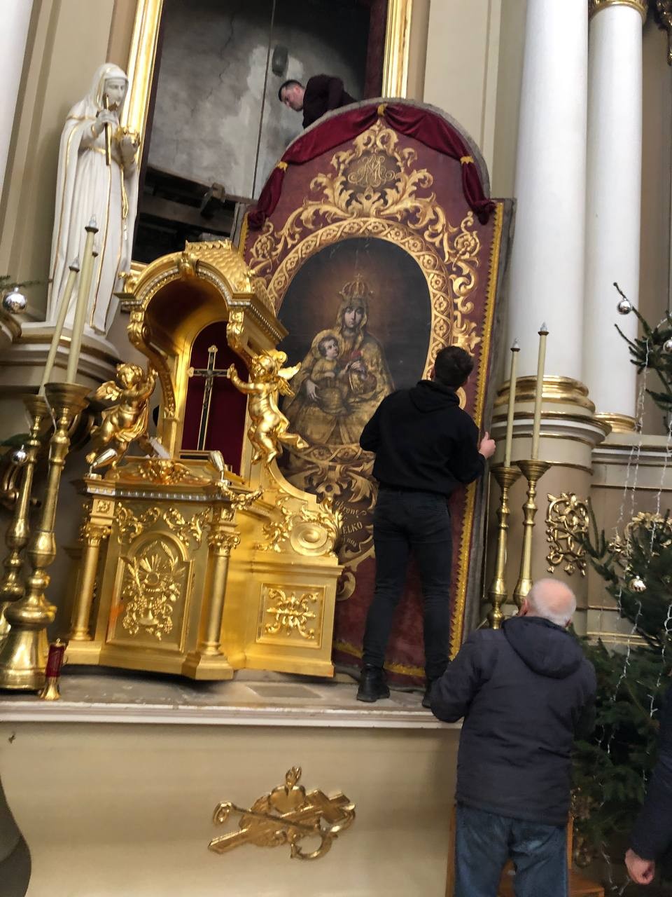 28 грудня після ранкової Святої Меси наші парафіяни - за що їм дякуємо, допомогли зняти з головного вівтаря образ Матері Божої, який перевезли на відновлення .