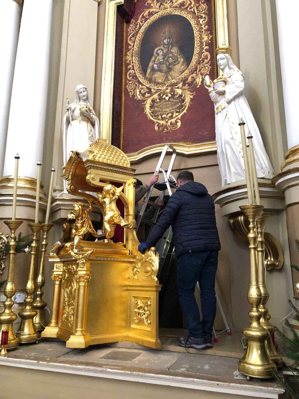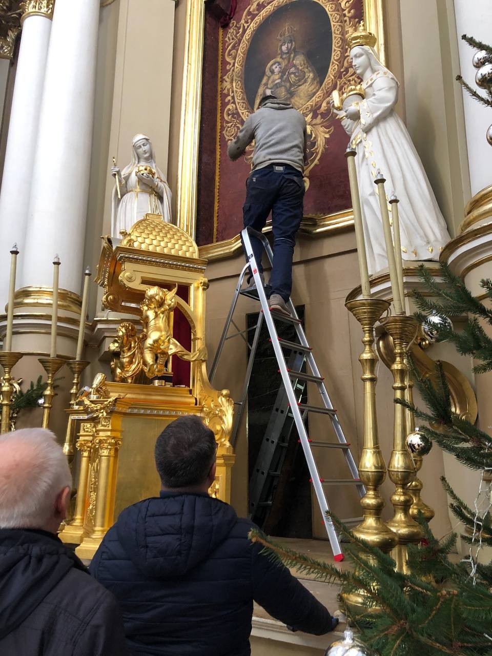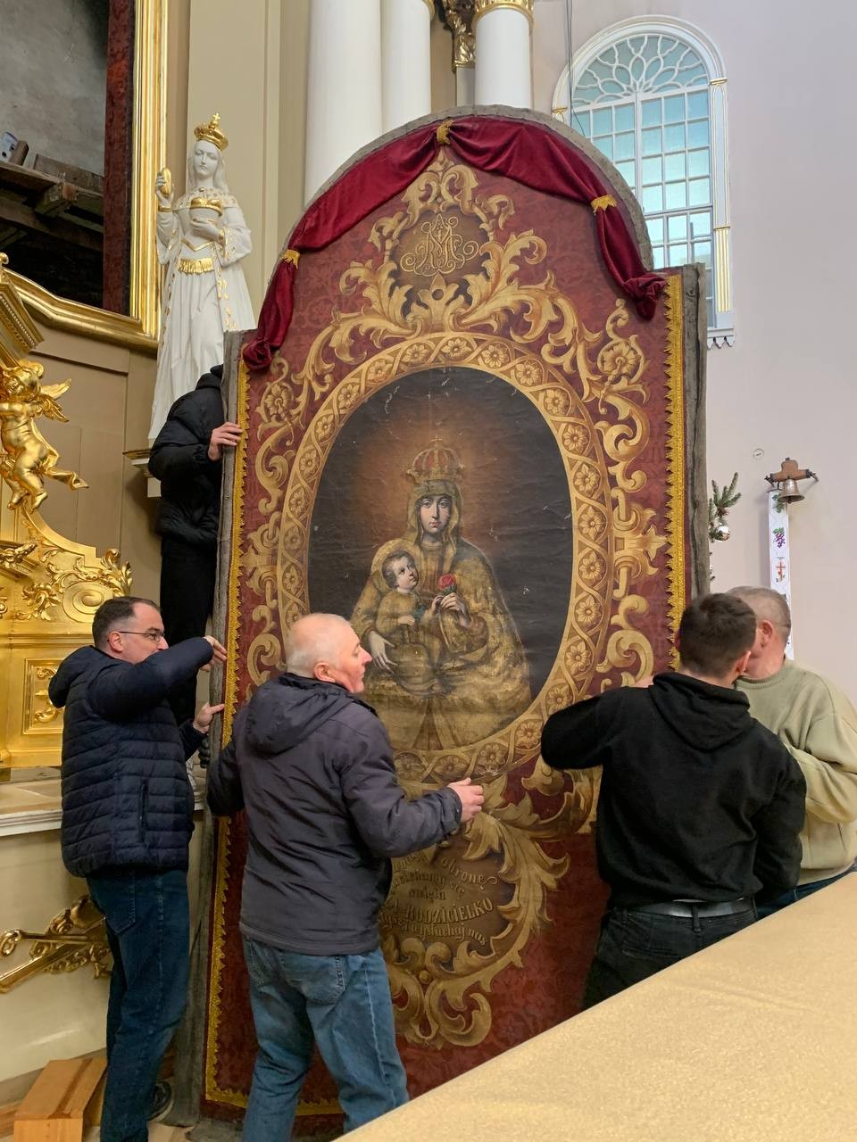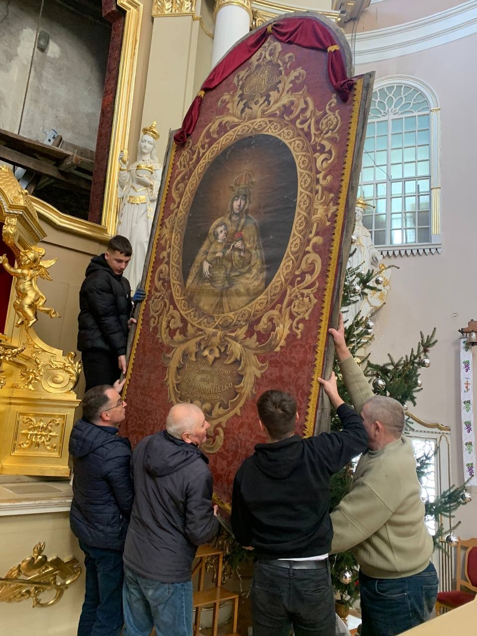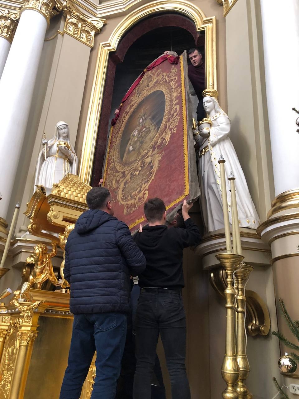 28 грудня після ранкової Святої Меси наші парафіяни - за що їм дякуємо, допомогли зняти з головного вівтаря образ Матері Божої, який перевезли на відновлення .