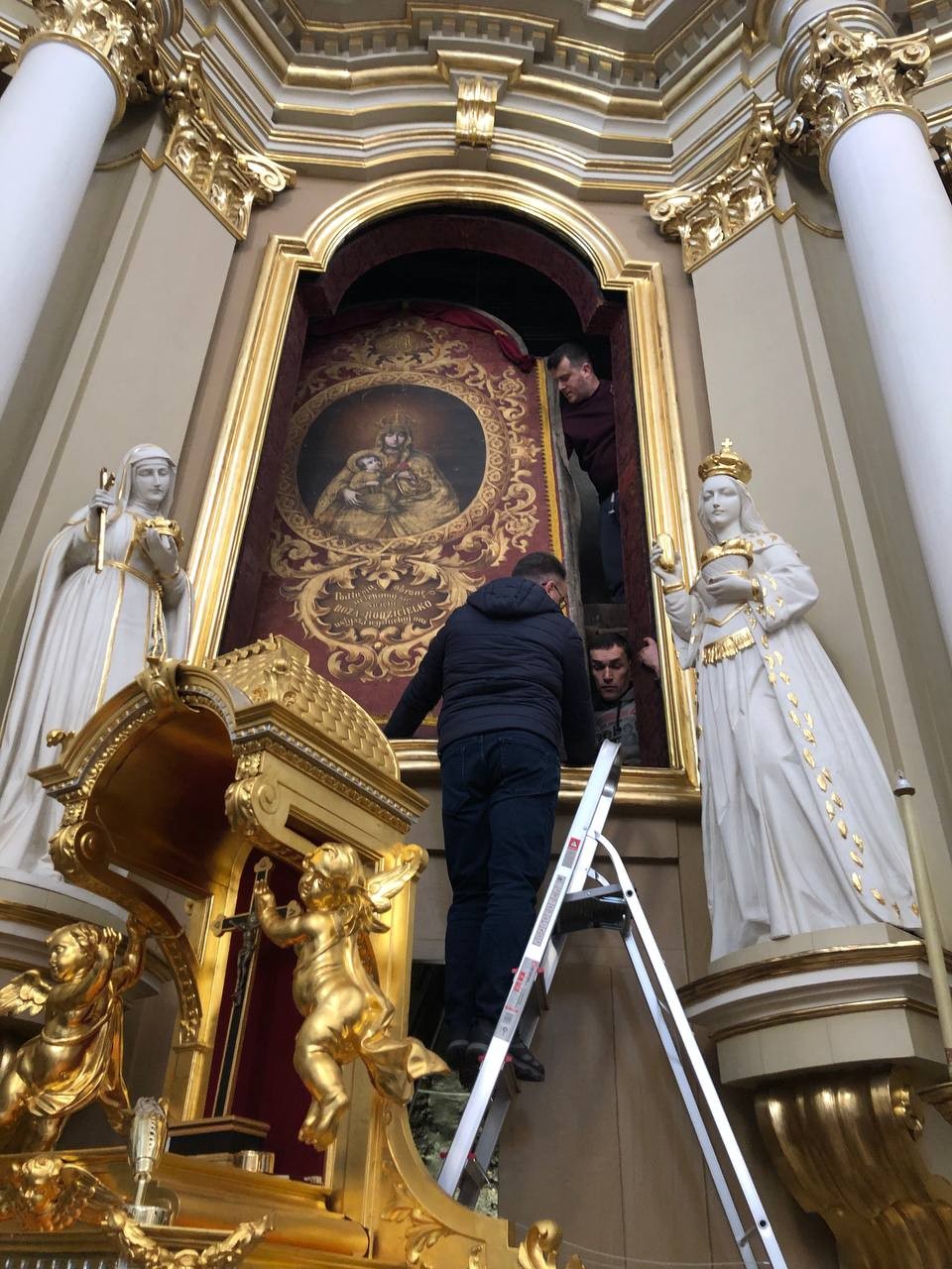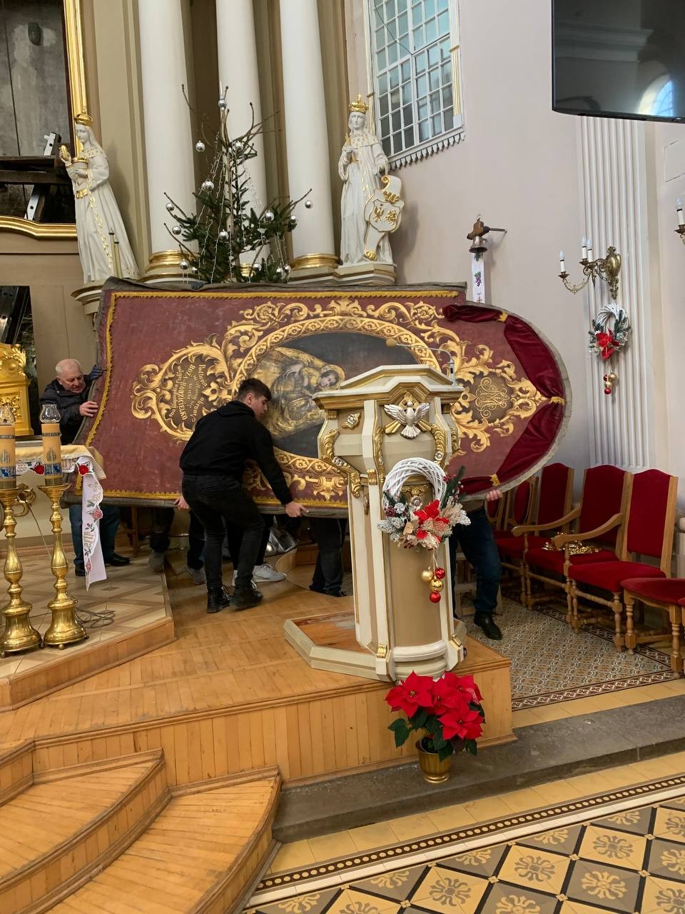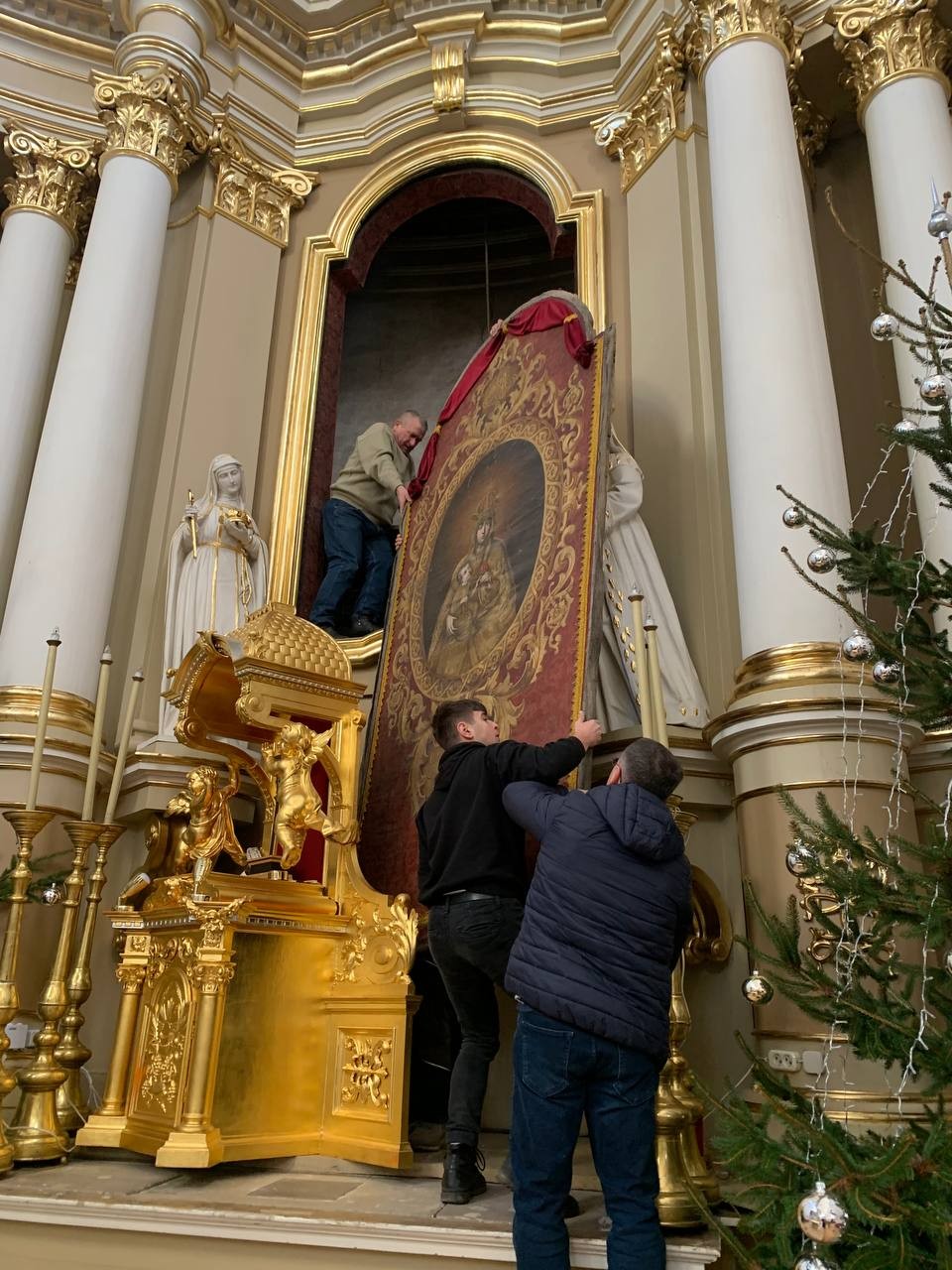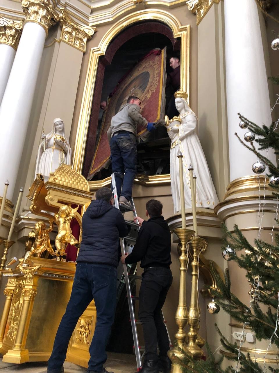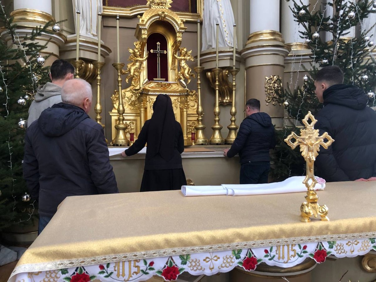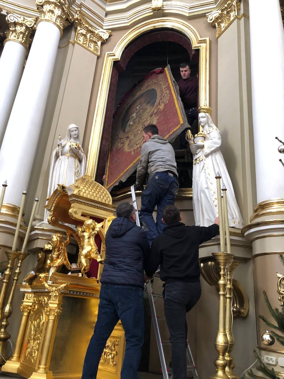 28 грудня після ранкової Святої Меси наші парафіяни - за що їм дякуємо, допомогли зняти з головного вівтаря образ Матері Божої, який перевезли на відновлення .