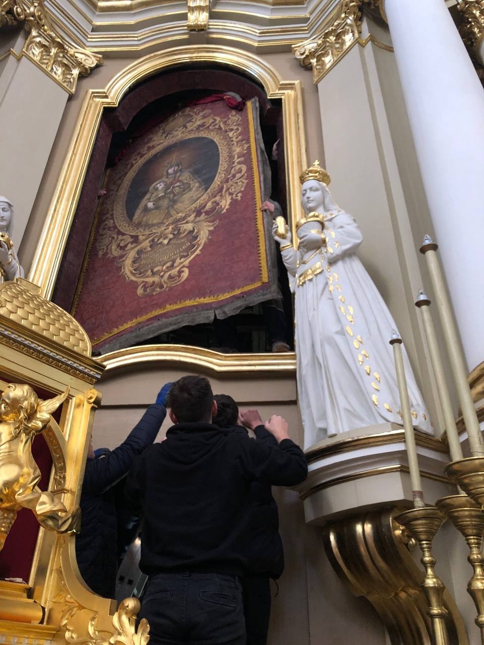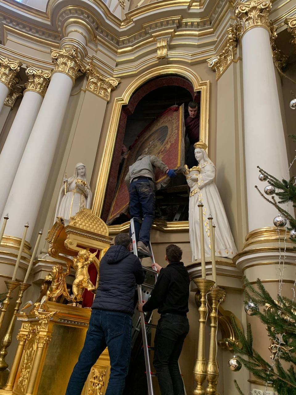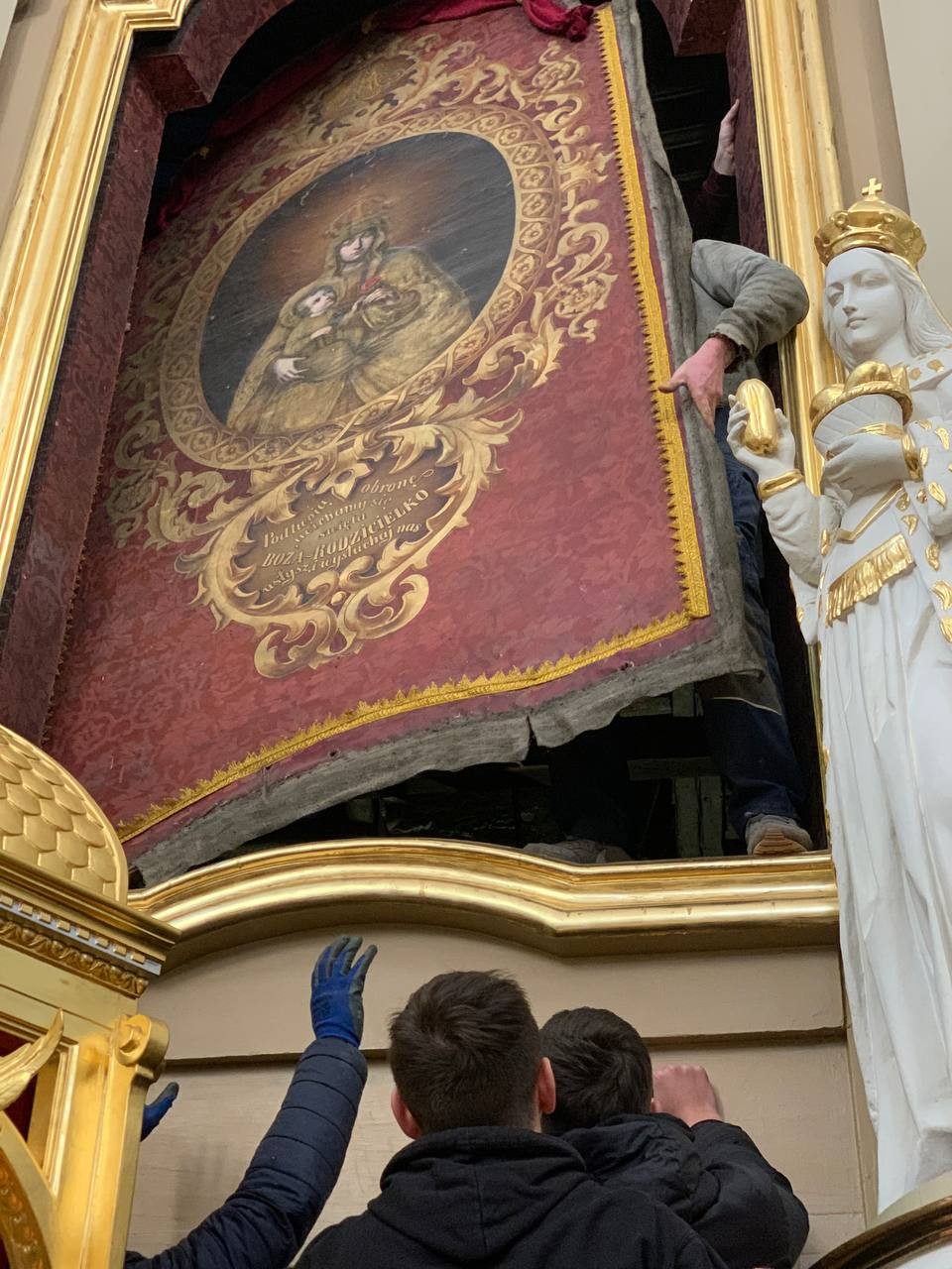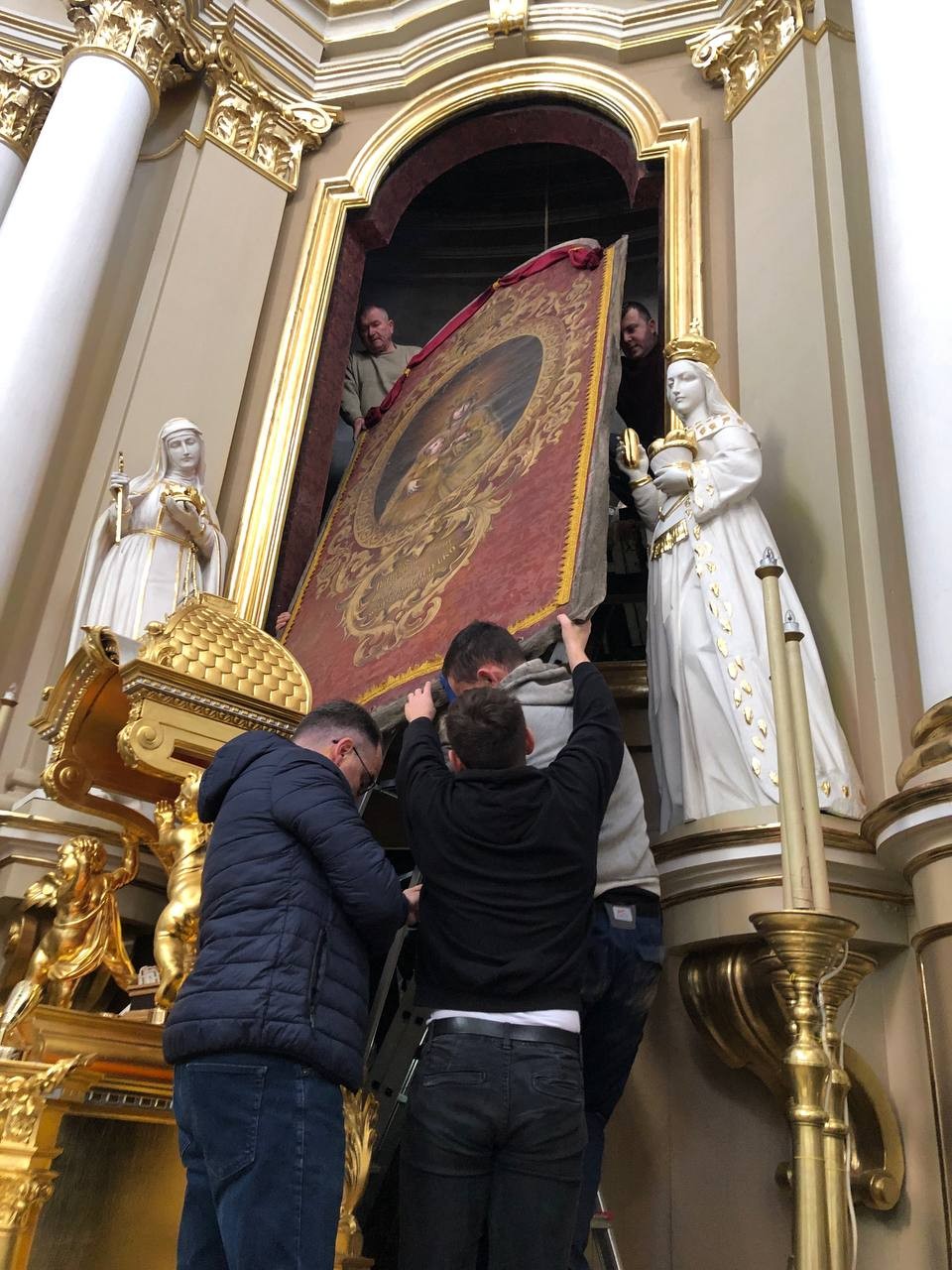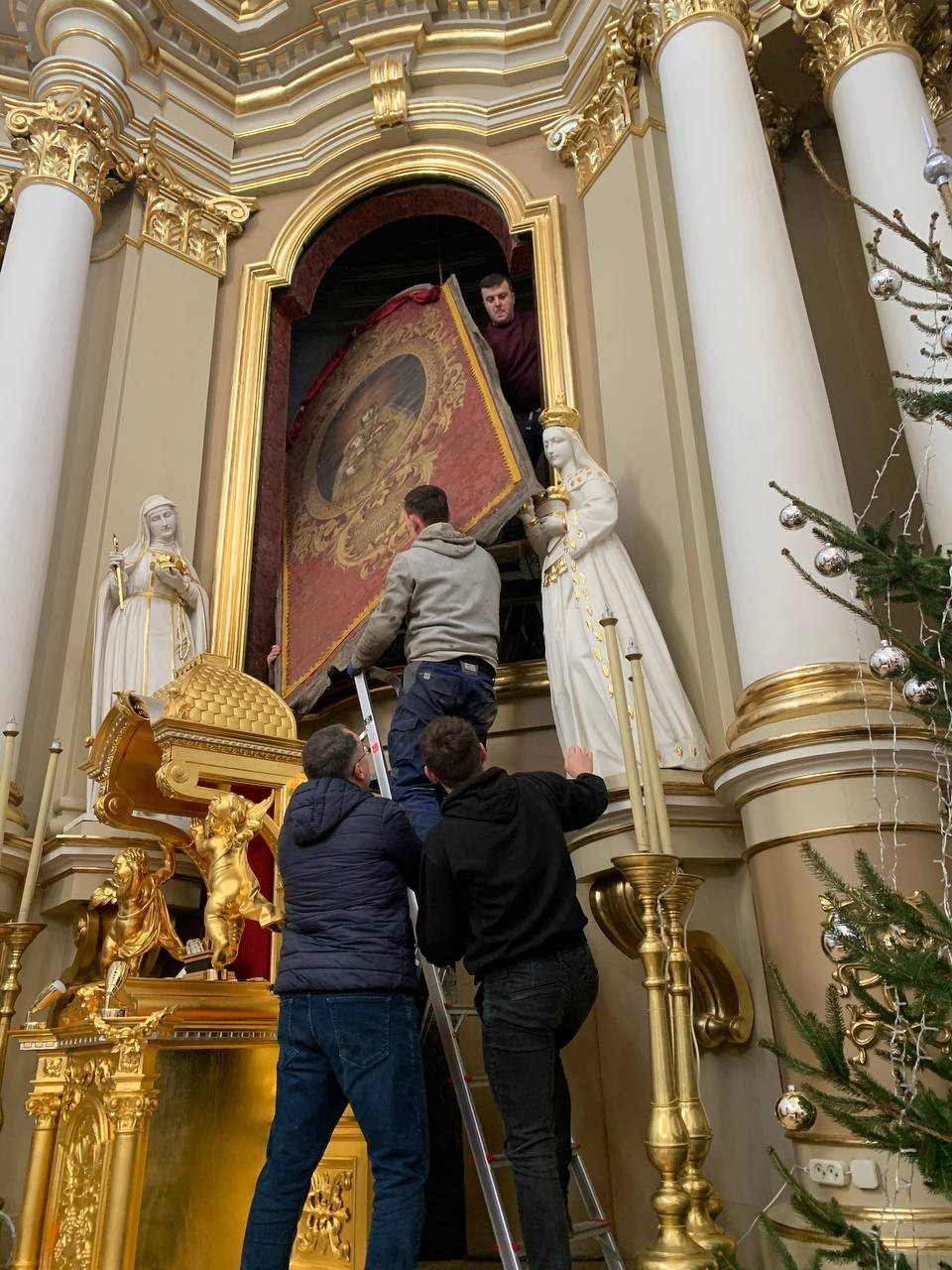 28 грудня після ранкової Святої Меси наші парафіяни - за що їм дякуємо, допомогли зняти з головного вівтаря образ Матері Божої, який перевезли на відновлення .