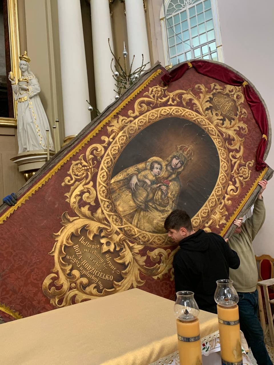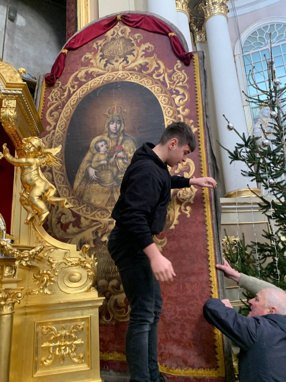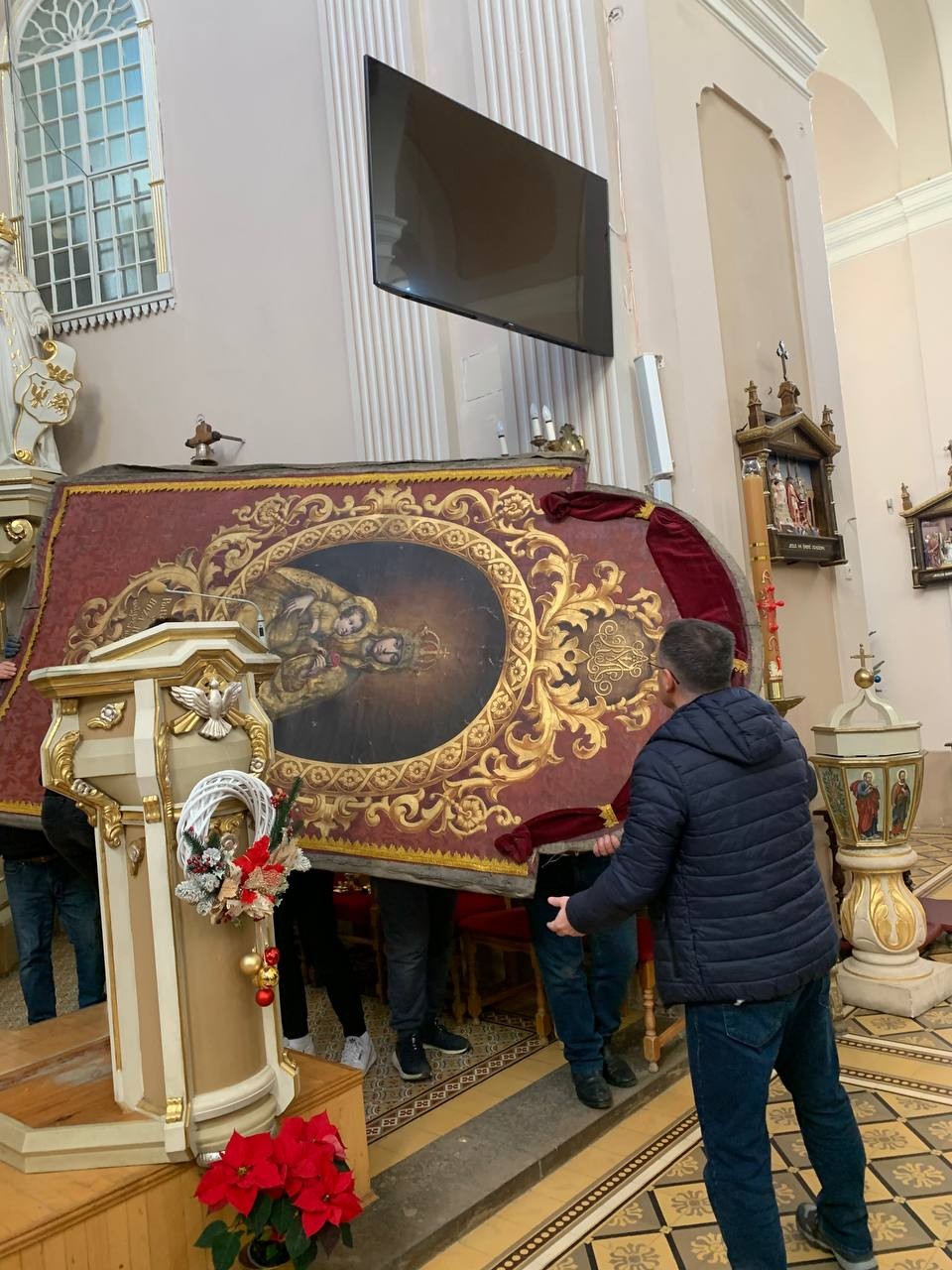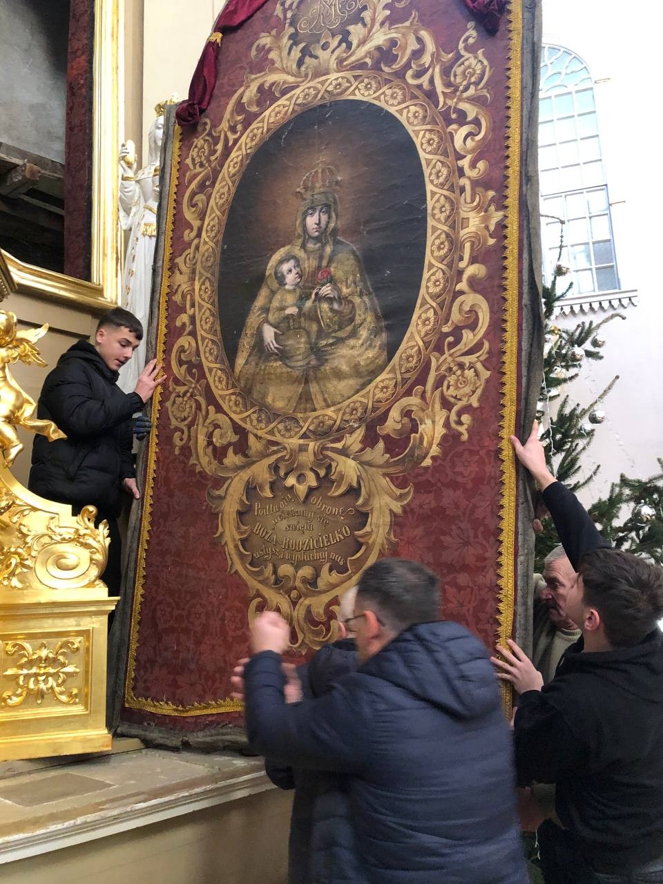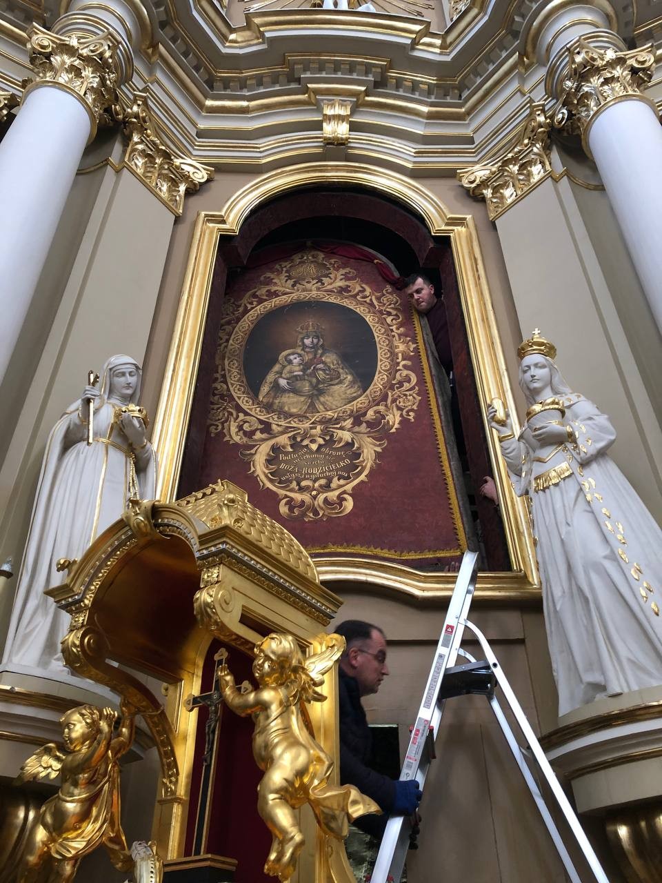 28 грудня після ранкової Святої Меси наші парафіяни - за що їм дякуємо, допомогли зняти з головного вівтаря образ Матері Божої, який перевезли на відновлення .